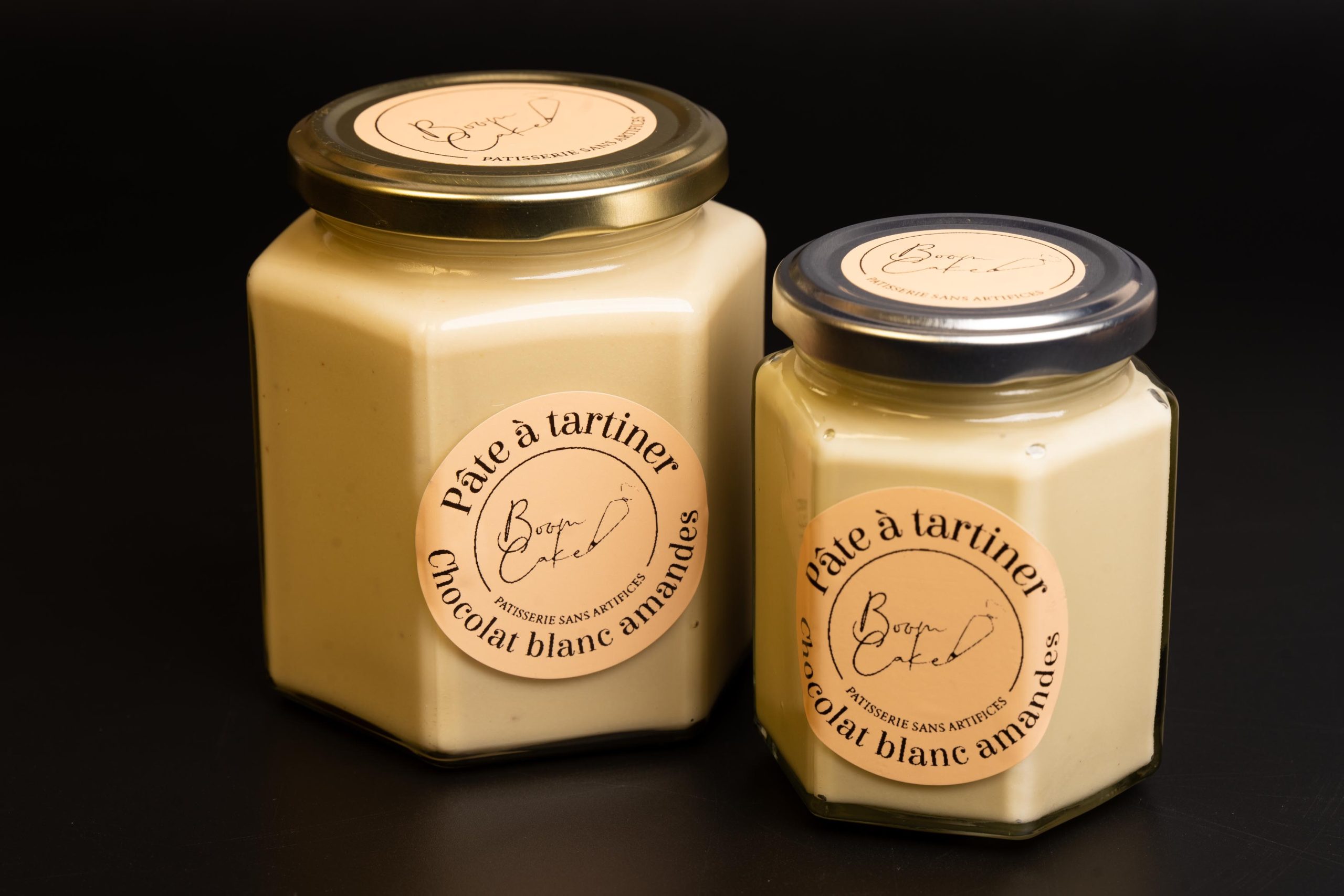 Pâte à tartiner chocolat blanc & amande, douce et fondante.
