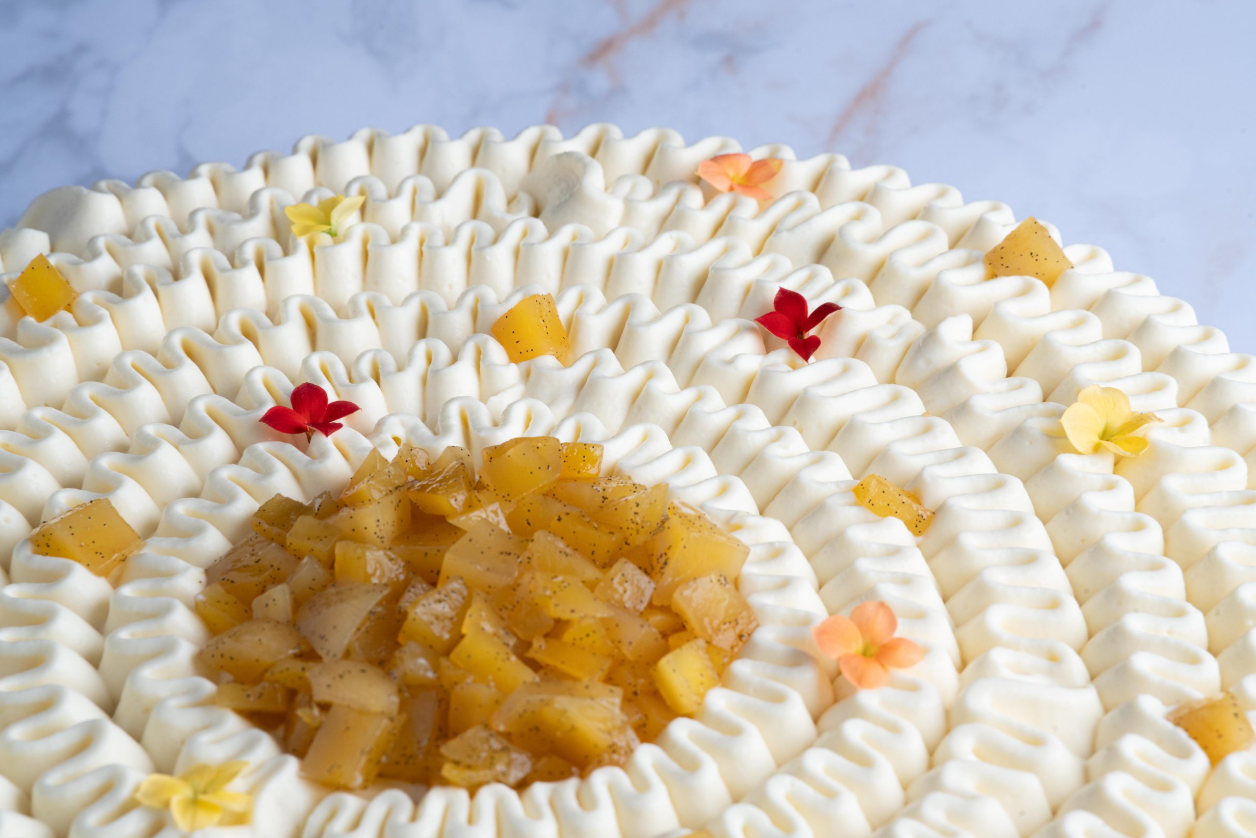 En finition, une ganache montée passion pochée en délicat tourbillon encadre un cœur généreux de cubes de mangue rôtie à la vanille de Madagascar, pour une touche ultime de douceur et d’exotisme.